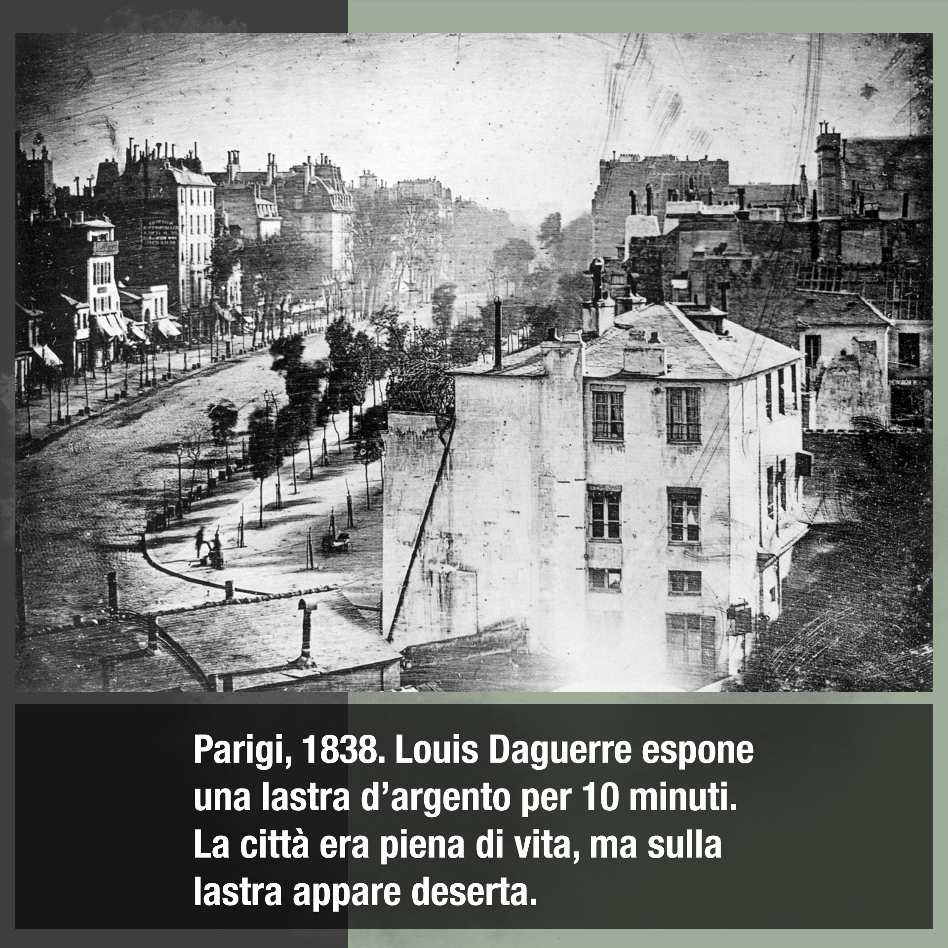Louis Daguerre è nel suo studio. L'aria è pesante, satura di vapori di iodio e mercurio. Fuori, il Boulevard du Temple è il cuore pulsante di Parigi. È soprannominato 'Boulevard del Crimine' per via dei tanti teatri che mettono in scena gialli e melodrammi. C’è vita, c’è caos. Daguerre punta la sua macchina – una scatola di legno pesante – fuori dalla finestra. Apre l'obiettivo.